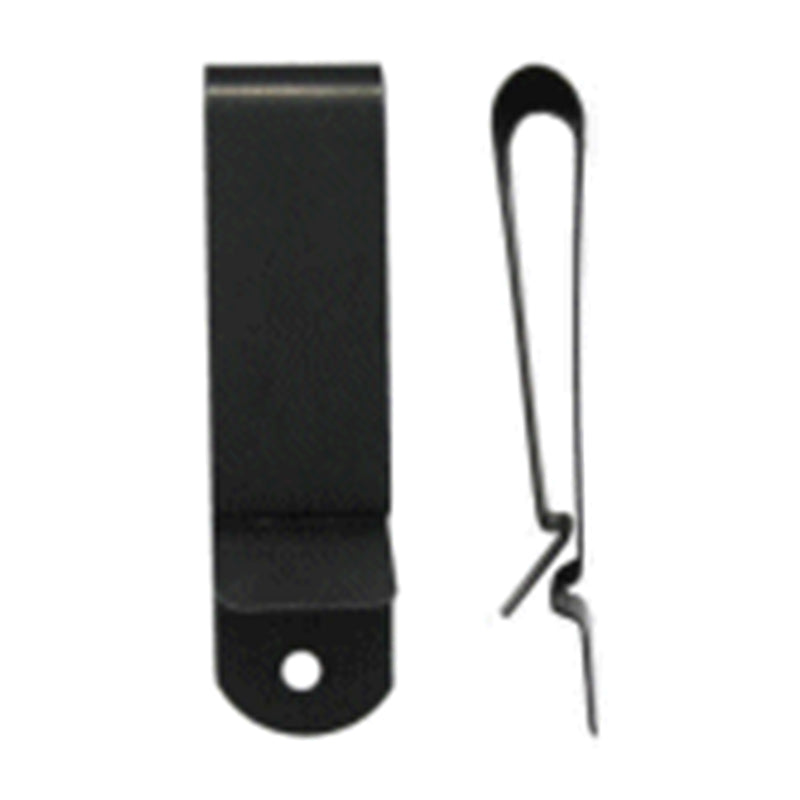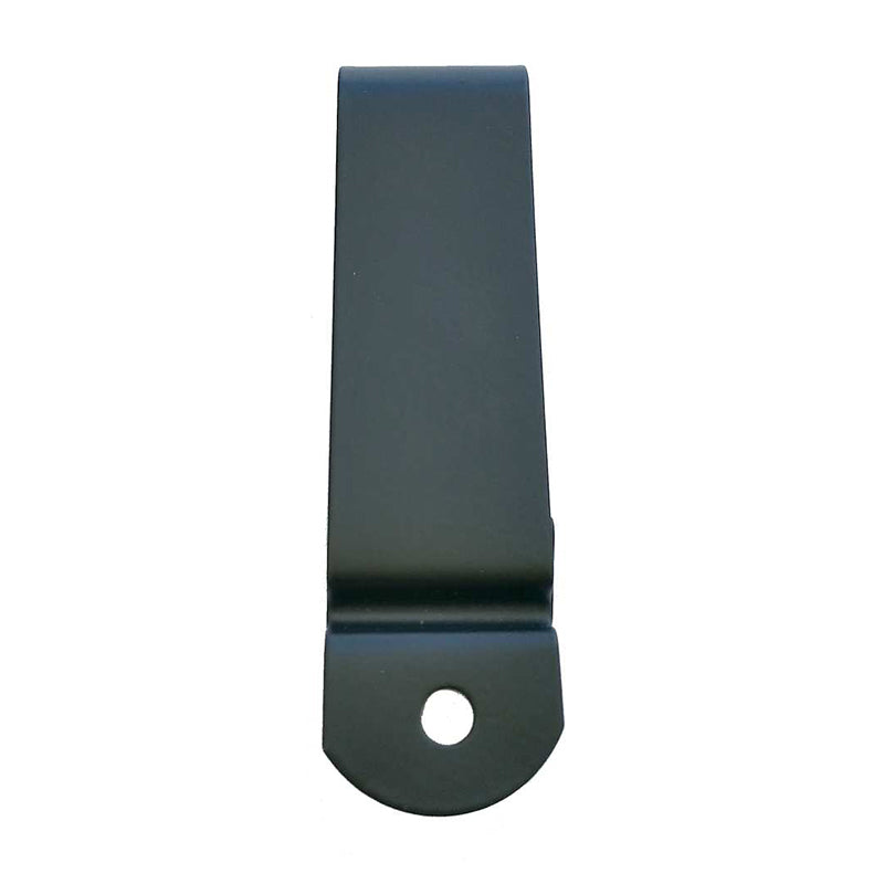 Metal belt holster clip. Available/in-stock in black oxide finish only. Specify your own finish for larger 1000+ piece orders.