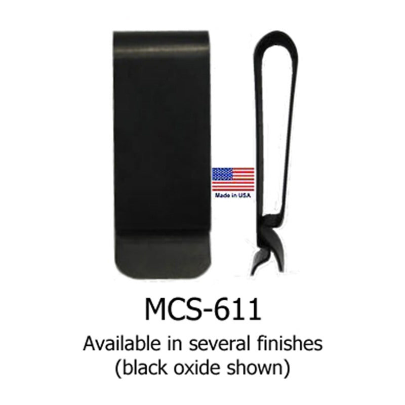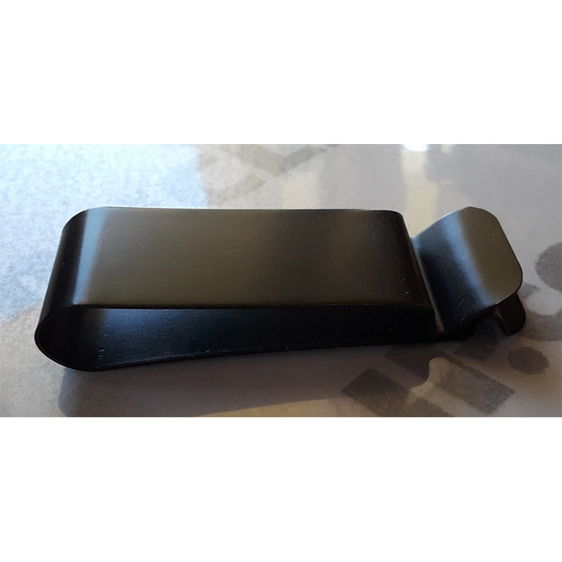 Metal belt holster clip. Available/in-stock in black oxide finish only. Specify your own finish for larger 1000+ piece orders. This is a 'tempered' steel holster clip.